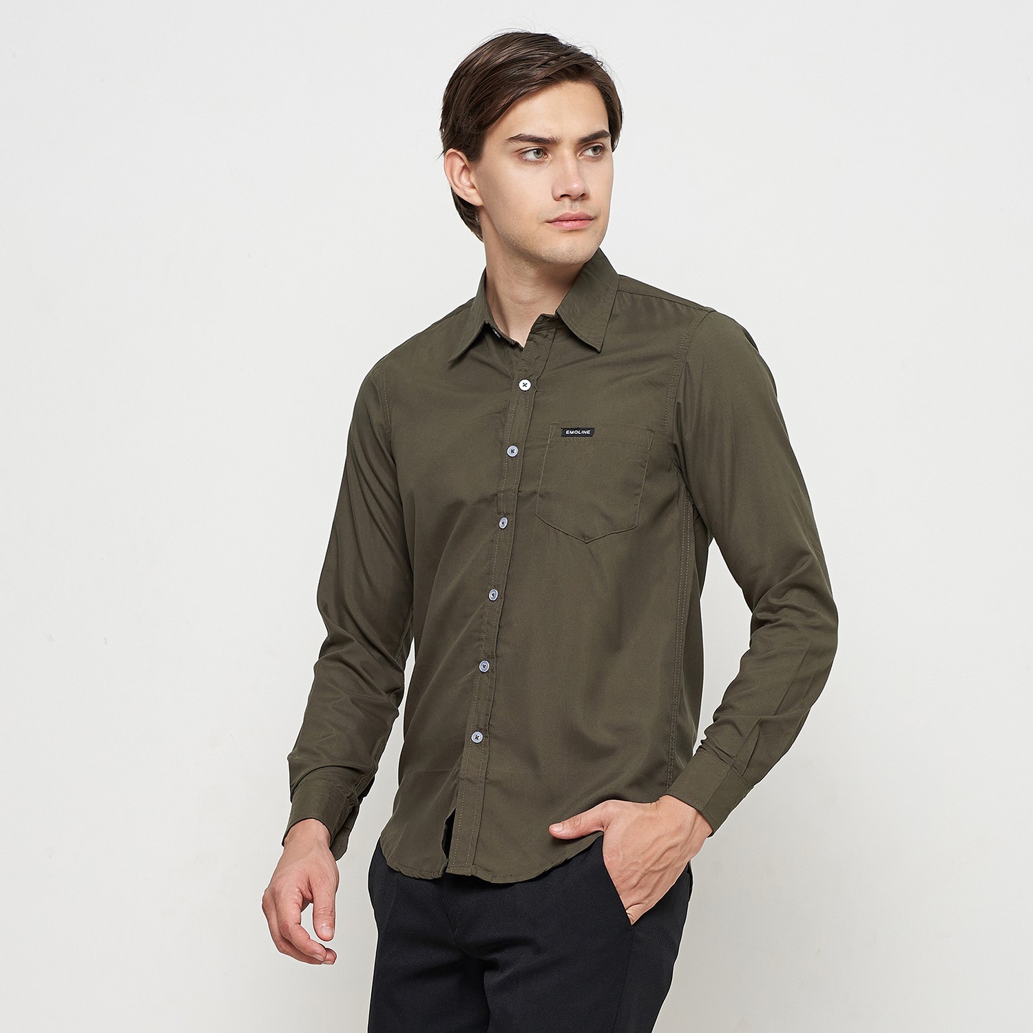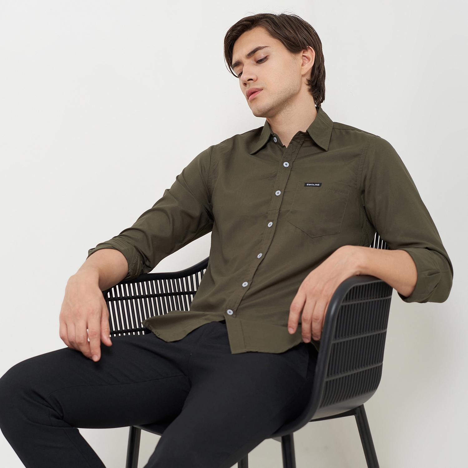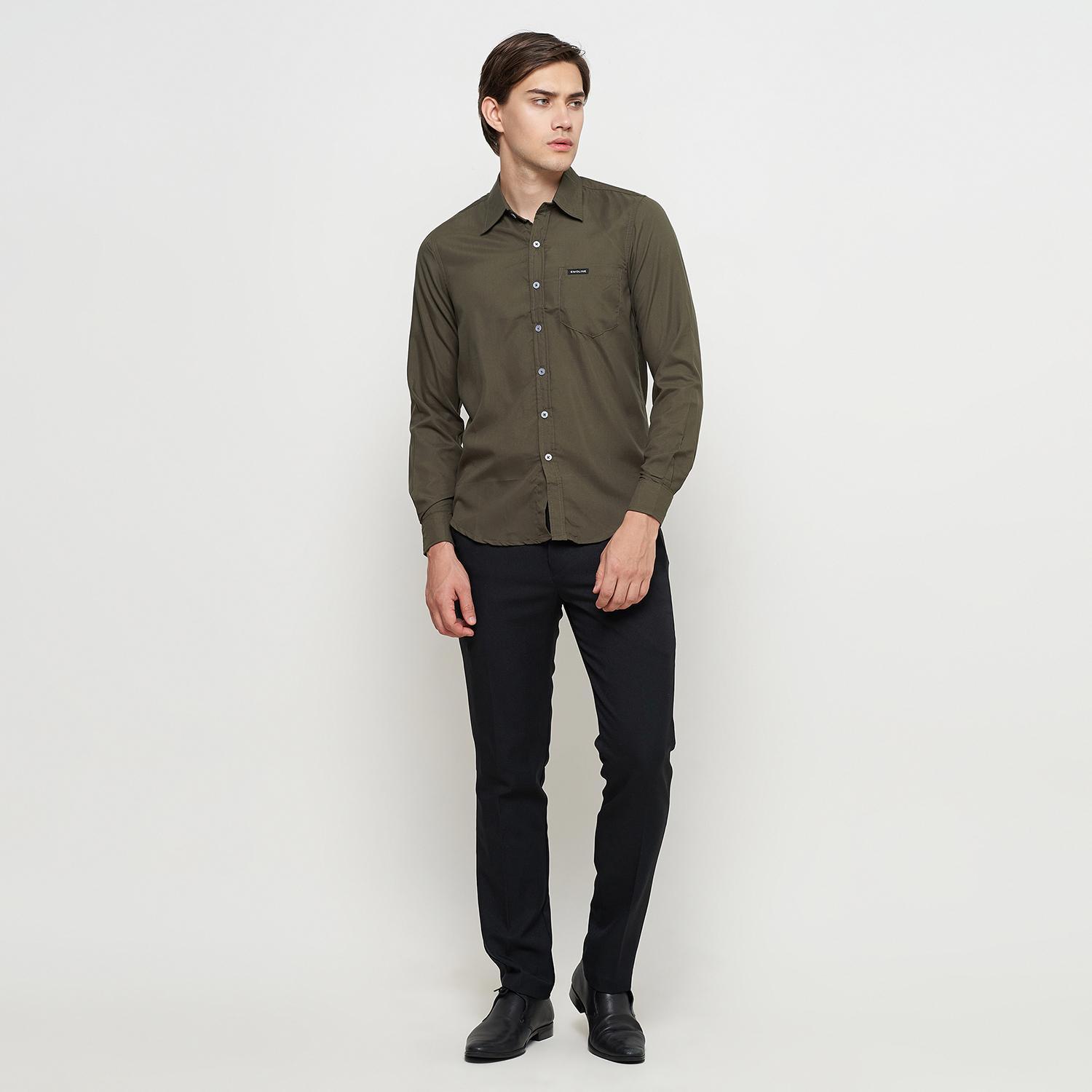 Kemeja Pria Basic Polos Panjang Hijau Army